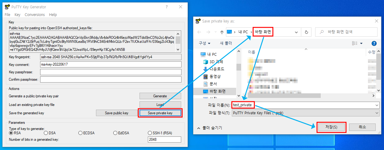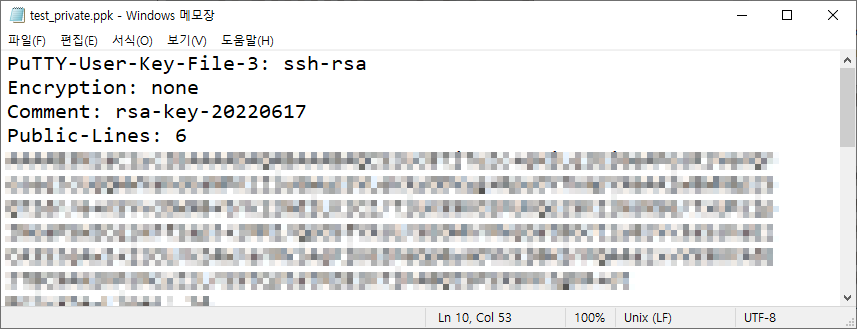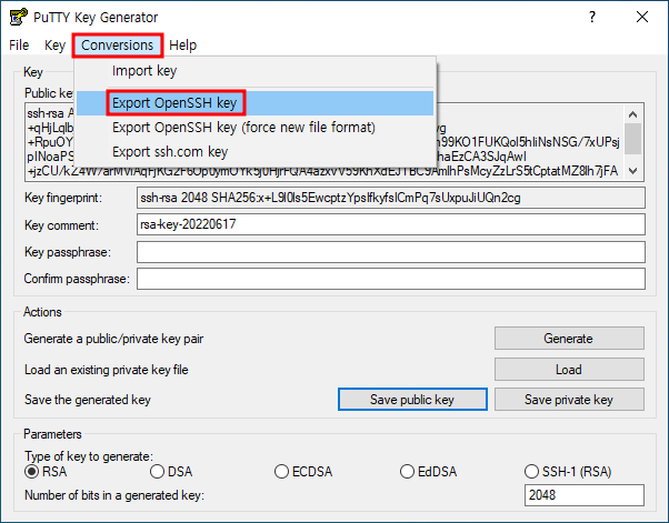 ※ 상단에 Conversions → Export OpenSSH key 선택하여 저장