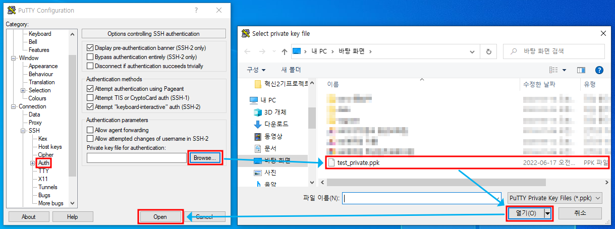 ※ Putty 접속 설정 후 Connection → SSH → Auth 탭에서 private key 파일 지정
