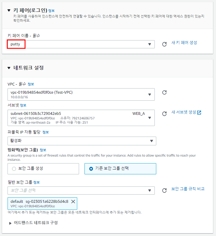 ※ 위에서 생성한 키 페어 설정