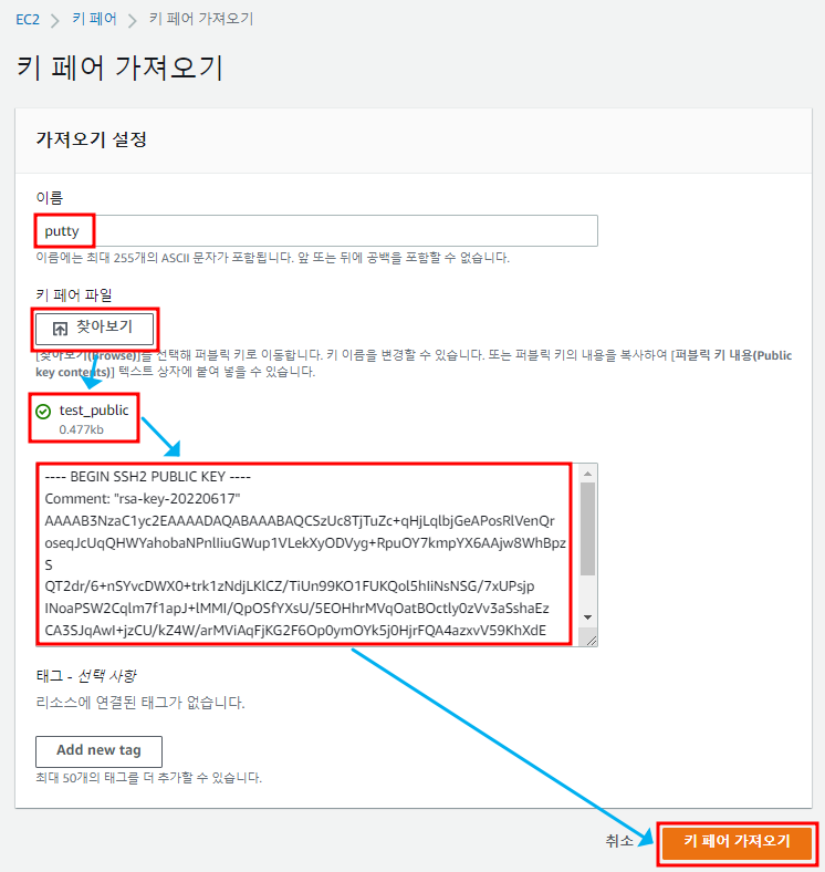 ※ 이름 설정 후 public key 파일 설정 후 키 페어 가져오기