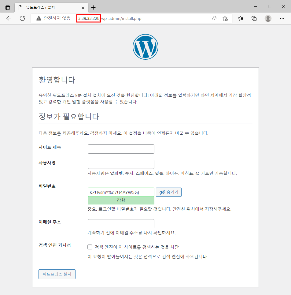 ※ 웹 브라우저에 publicIP 입력하여 접속 후 워드프레스 설치