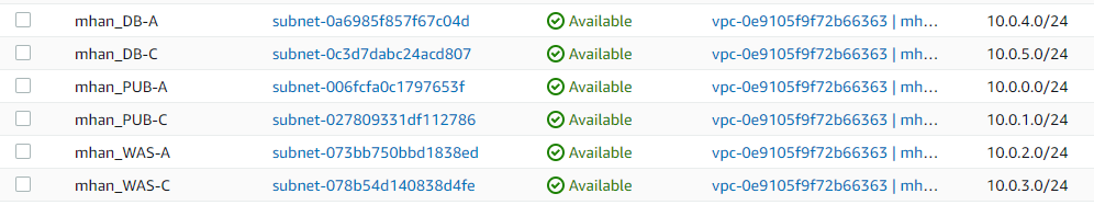- Private Subnet (mhan_WAS-C) : 10.0.3.0./24