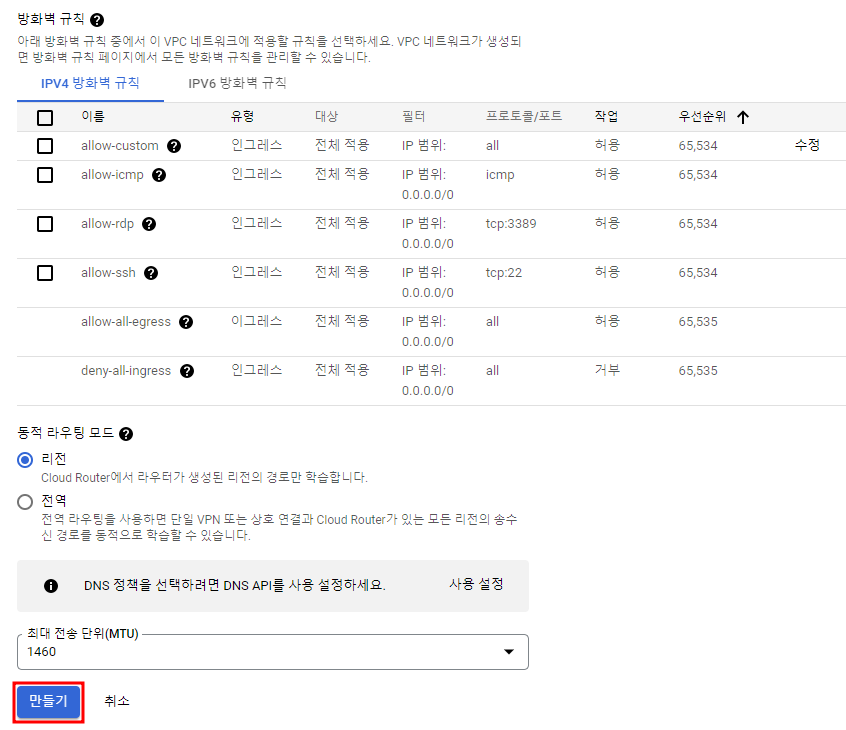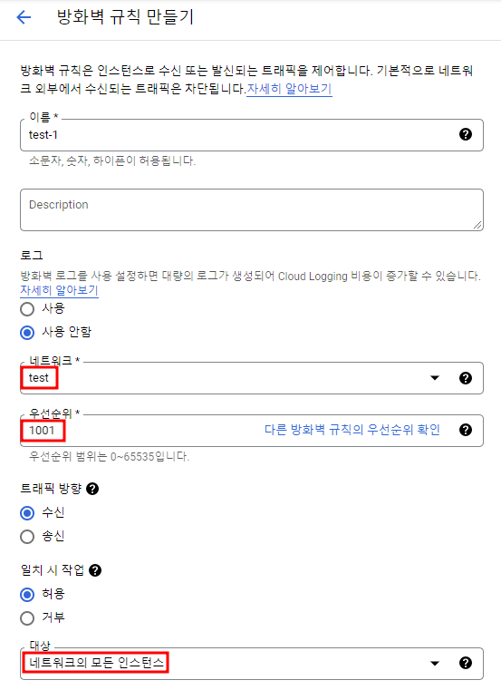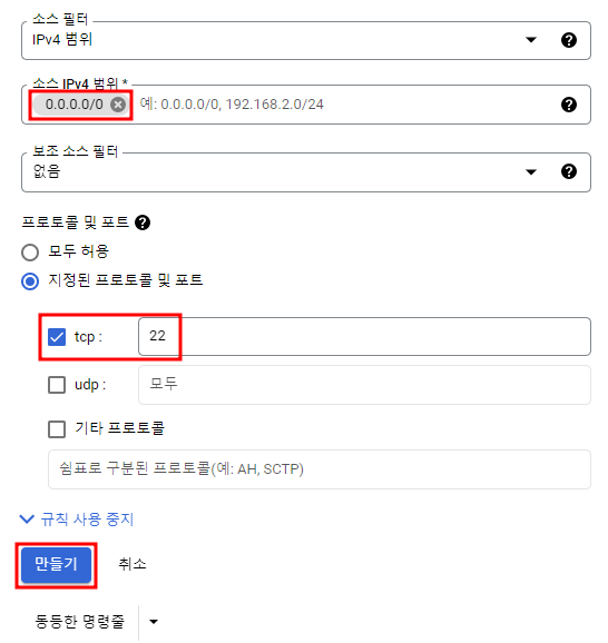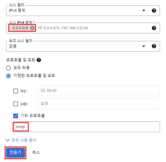 ※ VPC 네트워크 → 방화벽 → 방화벽 규칙 만들기