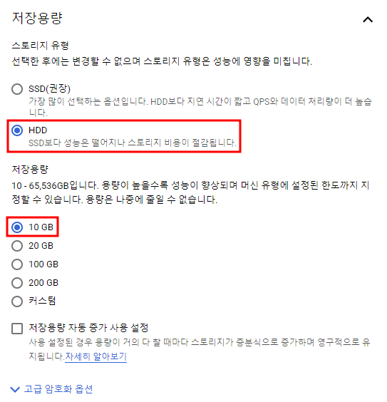 ※ 저장 용량 선택 (비용 절감을 위해 HDD/10GB 사용)