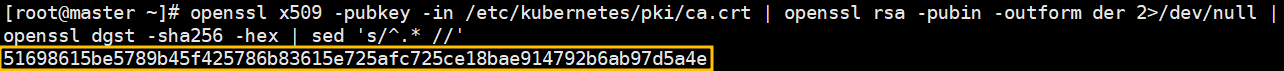 # openssl x509 -pubkey -in /etc/kubernetes/pki/ca.crt | openssl rsa -pubin -outform der 2>/dev/null | openssl dgst -sha256 -hex | sed 's/^.* //'