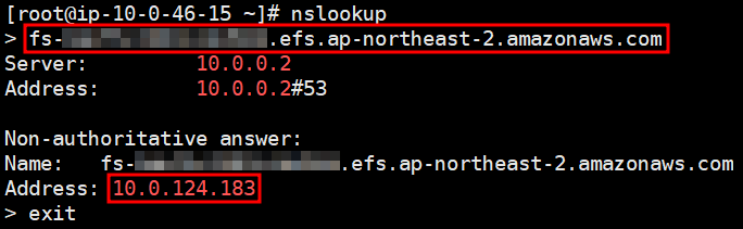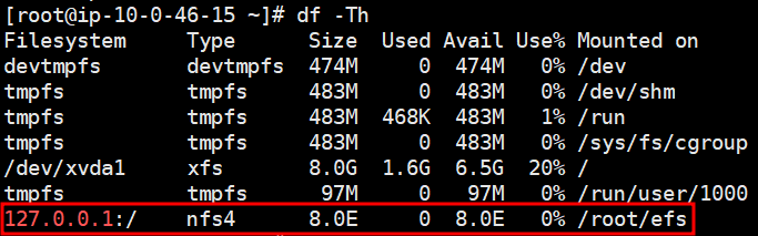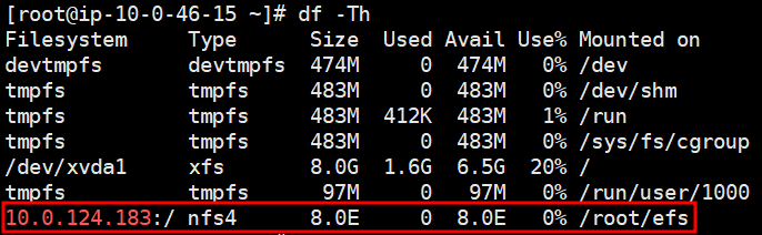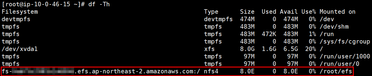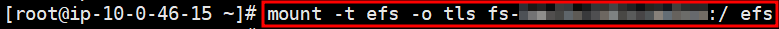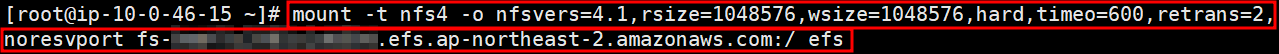 # sudo mount -t nfs4 -o nfsvers=4.1,rsize=1048576,wsize=1048576,hard,timeo=600,retrans=2,noresvport 10.0.124.183:/ efs