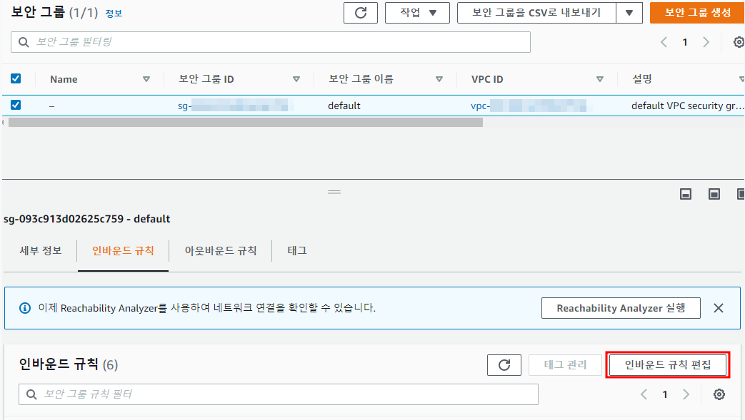※ 연결 전 VPC → 보안 그룹에서 인바운드 규칙 편집