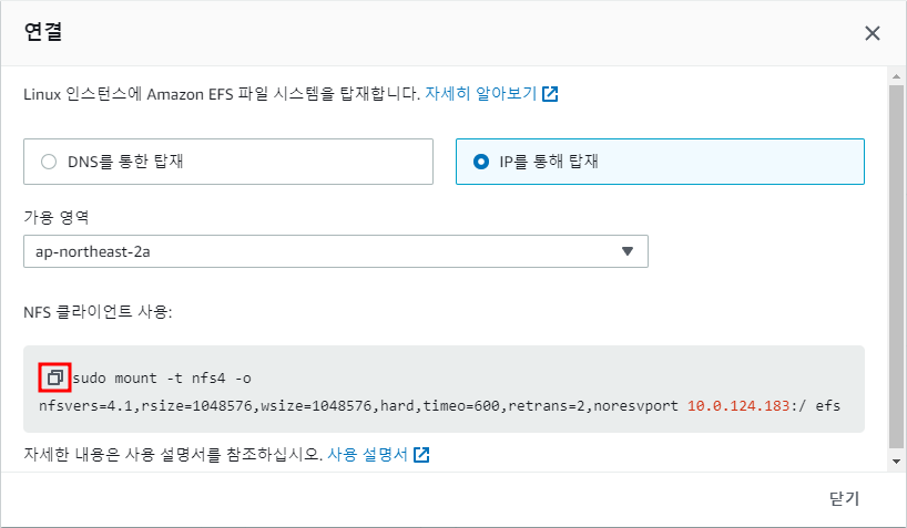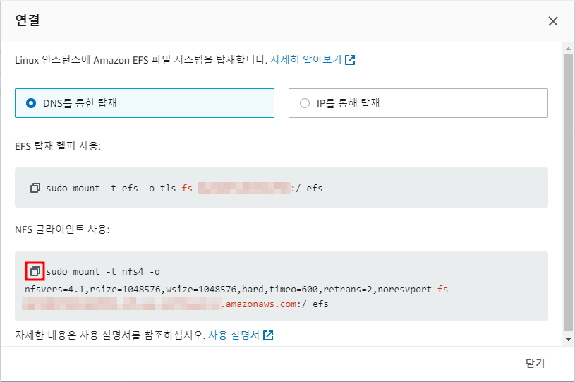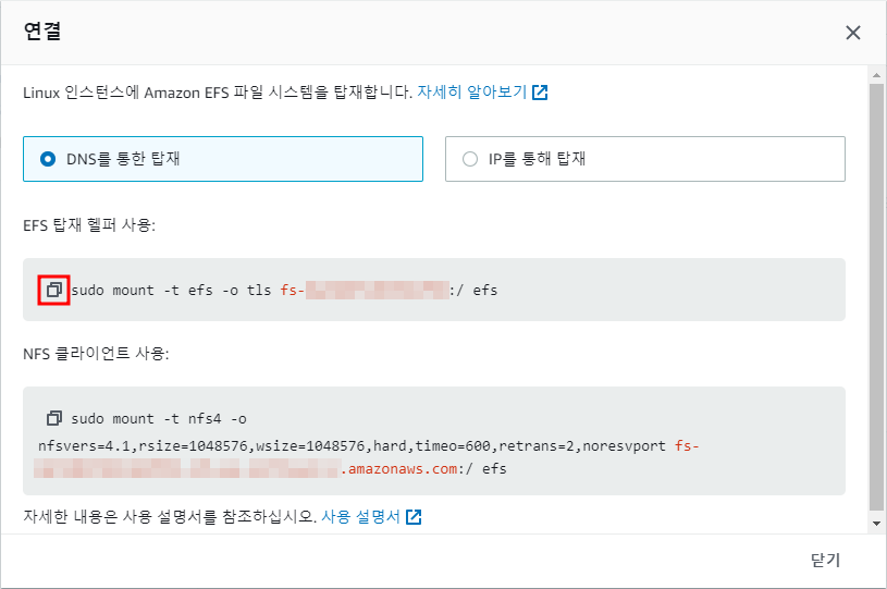 ※ EFS → 연결 → DNS를 통한 탑재 → NFS 클라이언트 사용 명령어 복사