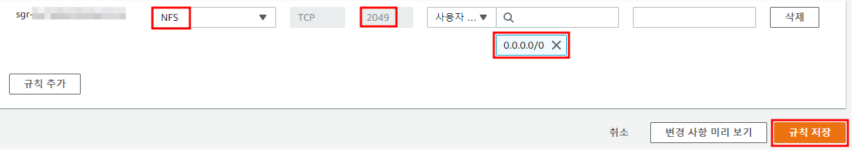 - 접속할 ec2 인스턴스가 EFS에 접근 가능하도록 NFS 포트를 인바운드에 추가한다.