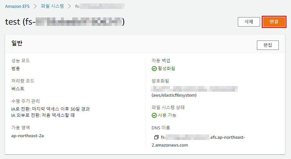※ 파일 시스템 생성이 완료되었으면 연결 버튼 클릭하여 연결 방법을 확인한다.