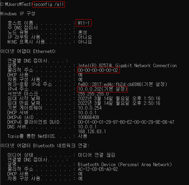 | SM: 255.255.255.0 네트워크 범위: 10.0.0.0~10.0.0.255 사용 가능: 10.0.0.1~10.0.0.254 DHCP 서버 IP: 10.0.0.1 DNS 서버 IP: 10.0.0.1, 8.8.8.8 Gateway: 10.0.0.254 |