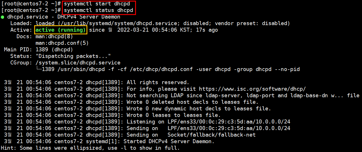 ※ dhcpd 실행 및 확인 (start 실행, status 확인)