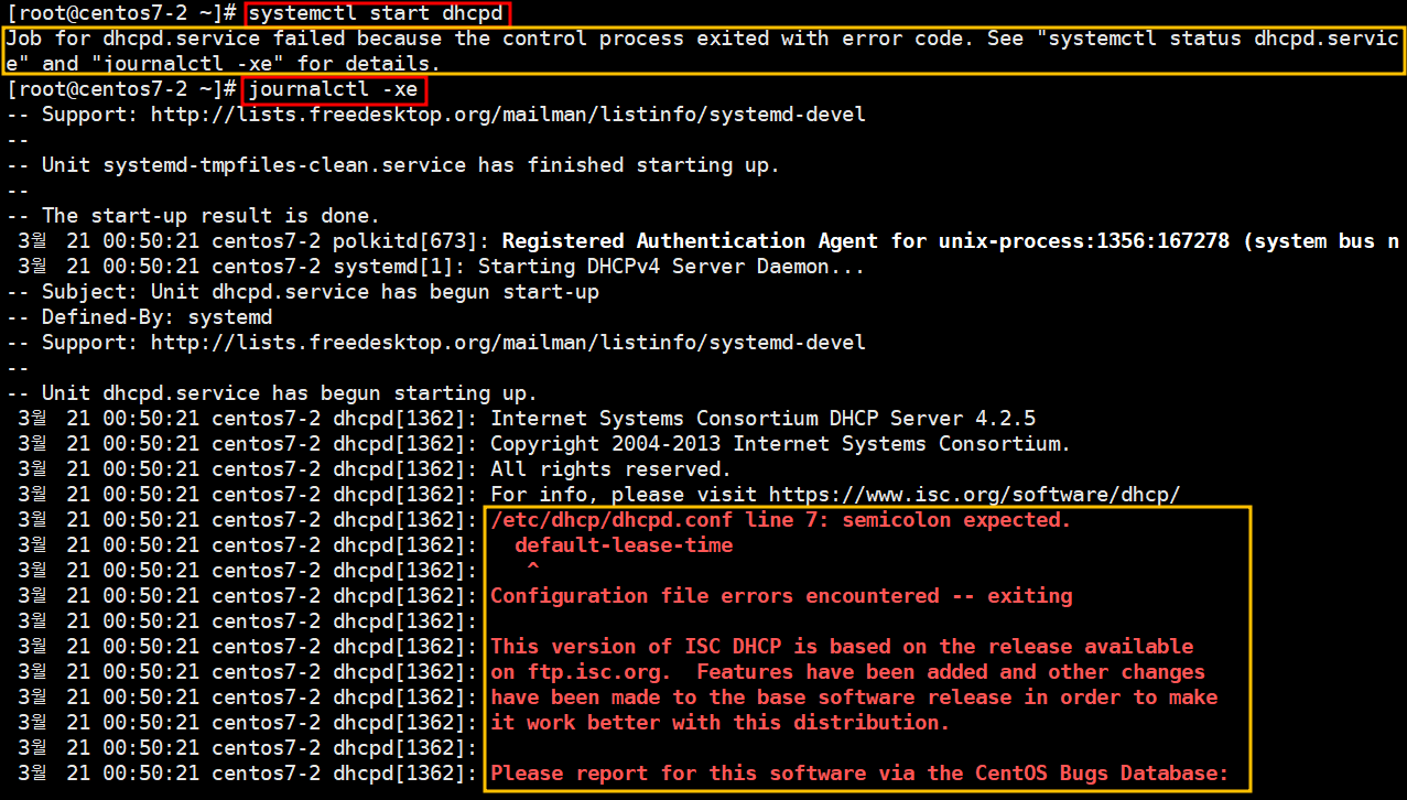 - dhcpd 실행 시 에러가 발생할 경우 아래와 같이 journalctl -xe 명령어를 통해 오류 내용을 확인할 수 있다.