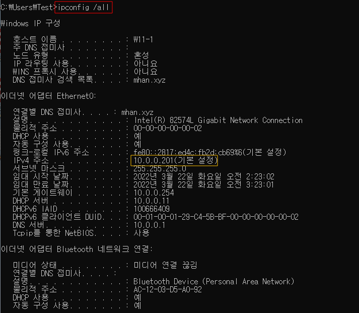 ※ W11-1에서 IP 받아와서 확인