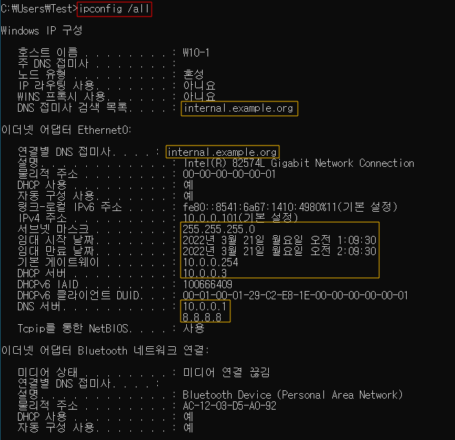 | SM: 255.255.255.0 네트워크 범위: 10.0.0.0~10.0.0.255 사용 가능: 10.0.0.1~10.0.0.254 DHCP 서버 IP: 10.0.0.1 DNS 서버 IP: 10.0.0.1, 8.8.8.8 Gateway: 10.0.0.254 |