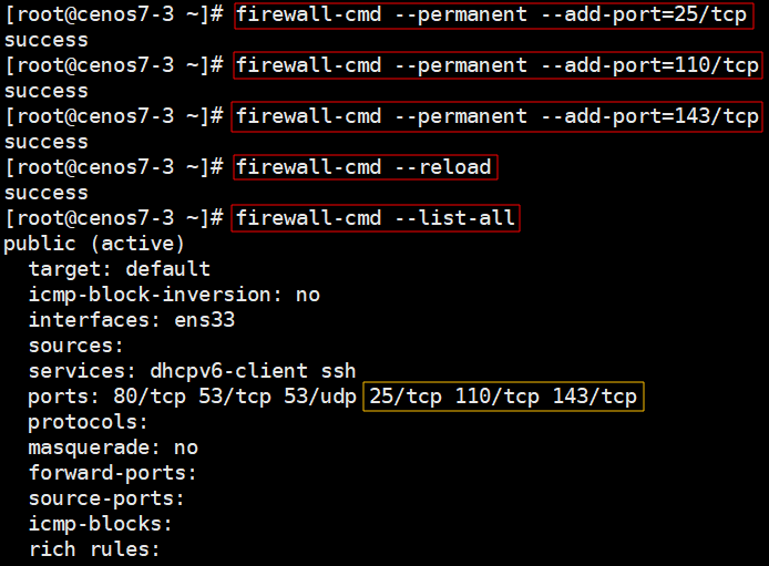 ※ 방화벽 오픈, 리로드 및 확인 (25, 110, 143)