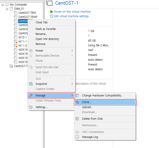 복제할 가상머신 우클릭 후 Manage > Clone 을 클릭하여 복제 진행