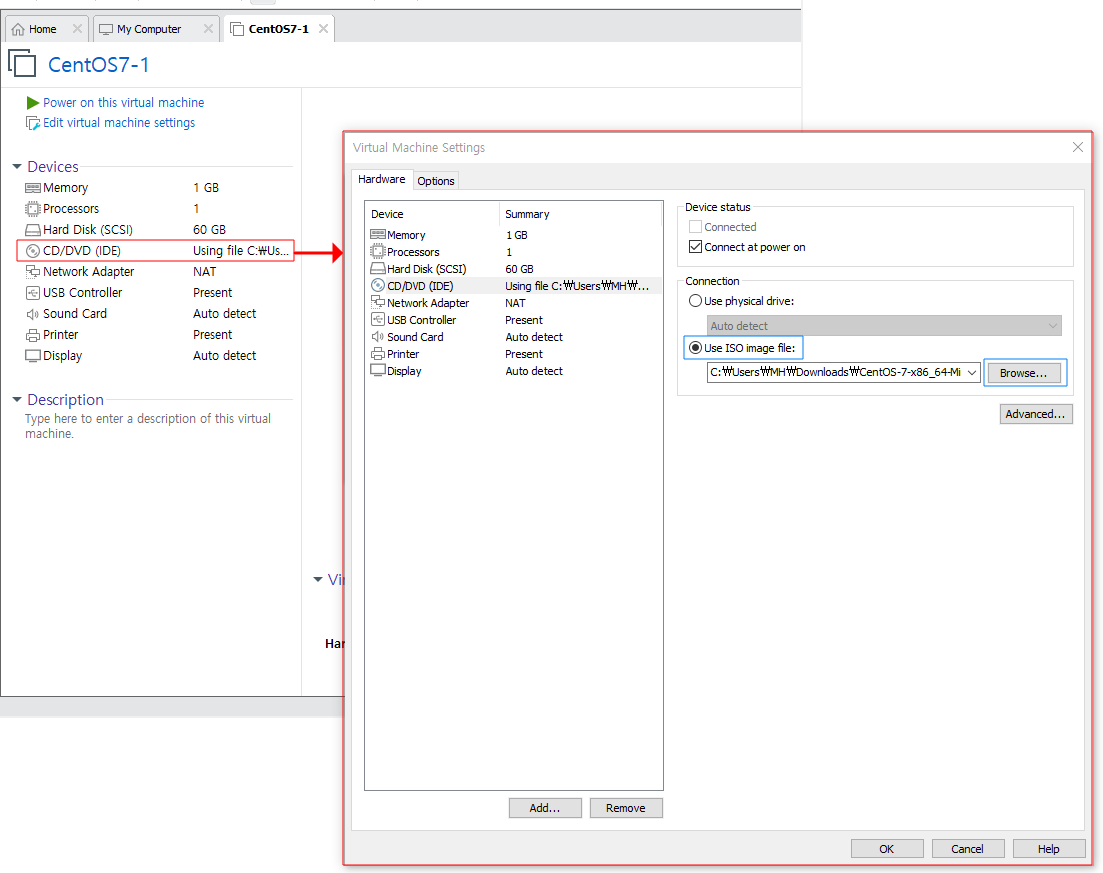 생성한 CentOS7 가상머신의 CD/DVD를 클릭하여 ISO 파일을 넣어준다.