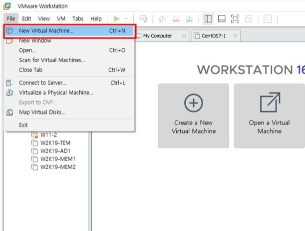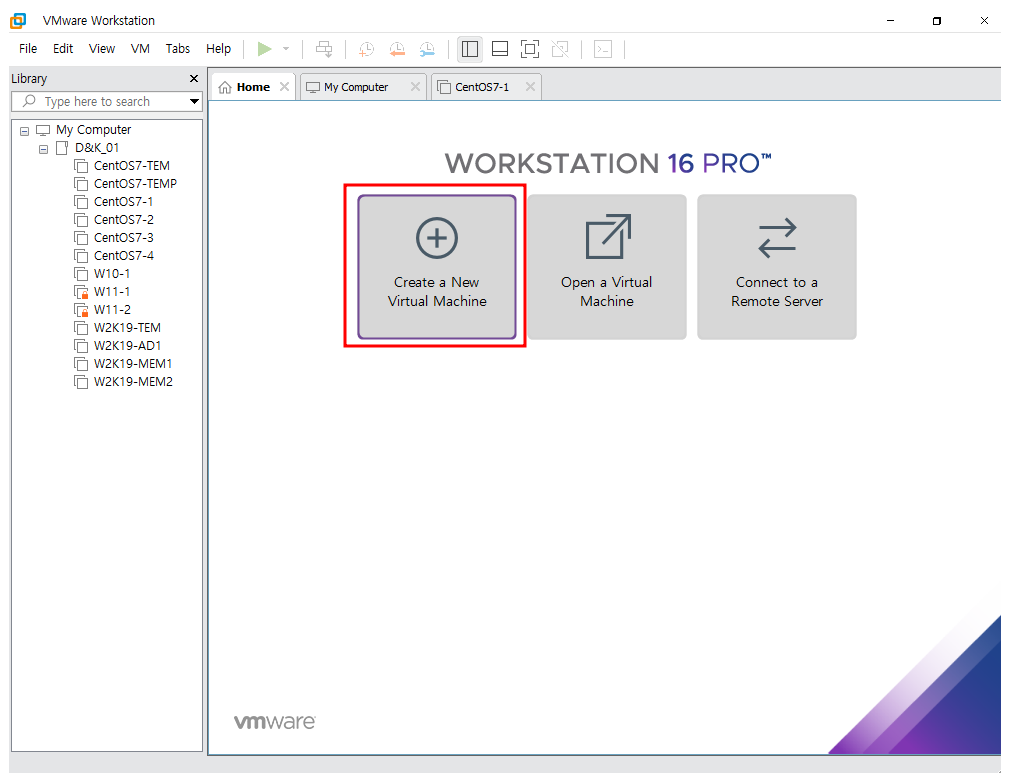 홈 화면의 Create a New Virtual Machine 또는 File > New Virtual Machine 을 통해 새로운 가상 머신을 생성한다.
