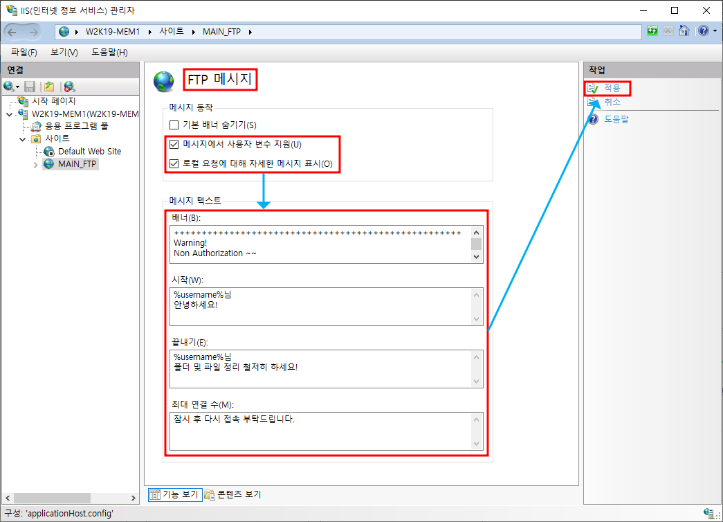 - 사용자 이름 디렉터리: FTP 루트 디렉터리 아래에 사용자 이름으로 폴더 생성 시 사용자 이름 폴더로 접속