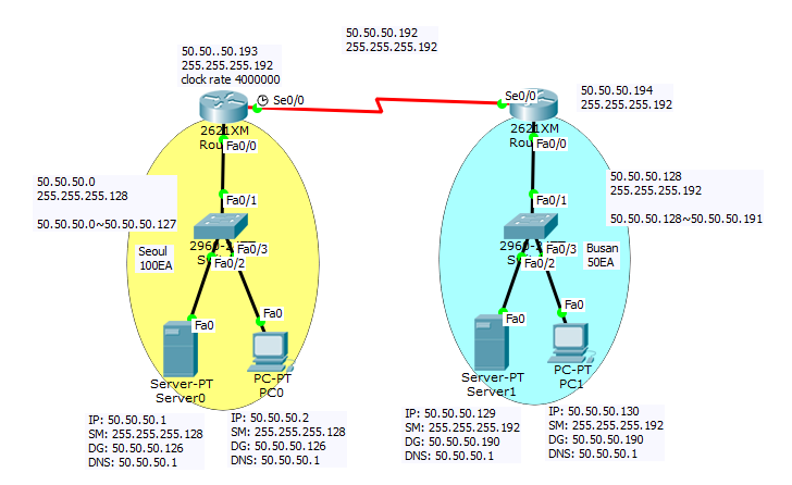 | Router>en Router#conf t Enter configuration commands, one per line. End with CNTL/Z. Router(config)#hostname Seoul_R1 Seoul_R1(config)#enable password babo1 Seoul_R1(config)#enable secret babo2 Seoul_R1(config)#no ip domain-lookup Seoul_R1(config)#service password-encryption Seoul_R1(config)#line con 0 Seoul_R1(config-line)#password babo3 Seoul_R1(config-line)#login Seoul_R1(config-line)#exec-timeout 0 0 Seoul_R1(config-line)#logging synchronous Seoul_R1(config-line)#exit Seoul_R1(config)#interface FastEthernet 0/0 Seoul_R1(config-if)#ip address 50.50.50.126 255.255.255.128 Seoul_R1(config-if)#no shutdown Seoul_R1(config-if)# %LINK-5-CHANGED: Interface FastEthernet0/0, changed state to up %LINEPROTO-5-UPDOWN: Line protocol on Interface FastEthernet0/0, changed state to up Seoul_R1(config-if)#exit Seoul_R1(config)#inter Seoul_R1(config)#interface serial 0/0 Seoul_R1(config-if)#ip add Seoul_R1(config-if)#ip address 50.50.50.193 255.255.255.192 Seoul_R1(config-if)#clock rate 4000000 Seoul_R1(config-if)#no shutdown %LINK-5-CHANGED: Interface Serial0/0, changed state to down Seoul_R1(config-if)#exit Seoul_R1(config)#ip route 50.50.50.128 255.255.255.192 50.50.50.194 Seoul_R1(config)#do wr |