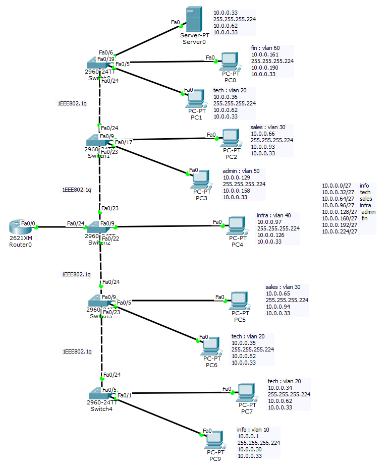 | en conf t hostname 3F_R1 enable pass babo1 enable sec babo2 no ip domain-l ser pass line console 0 pass babo3 login exe 0 0 logg syn exit line vty 0 4 pass babo4 login exit interface f0/0 no sh exit interface fastEthernet 0/0.10 encapsulation dot1Q 10 ip address 10.0.0.30 255.255.255.224 no sh exit interface f 0/0.20 encapsulation dot1Q 20 ip address 10.0.0.62 255.255.255.224 no sh exit interface f0/0.30 en dot1Q 30 ip add 10.0.0.94 255.255.255.224 no sh exit interface f0/0.40 encapsulation dot1Q 40 ip add 10.0.0.126 255.255.255.224 no sh exit interface f0/0.50 encapsulation dot1Q 50 ip add 10.0.0.158 255.255.255.224 no sh exit interface f 0/0.60 encapsulation dot1Q 60 ip add 10.0.0.190 255.255.255.224 no sh exit do wr |