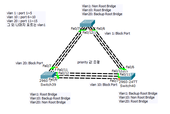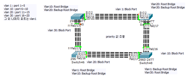 - 나머지 port의 cost 값은 동일하기 때문에 Bridge ID 값이 높은 쪽이 대체포트로 지정되어 차단
