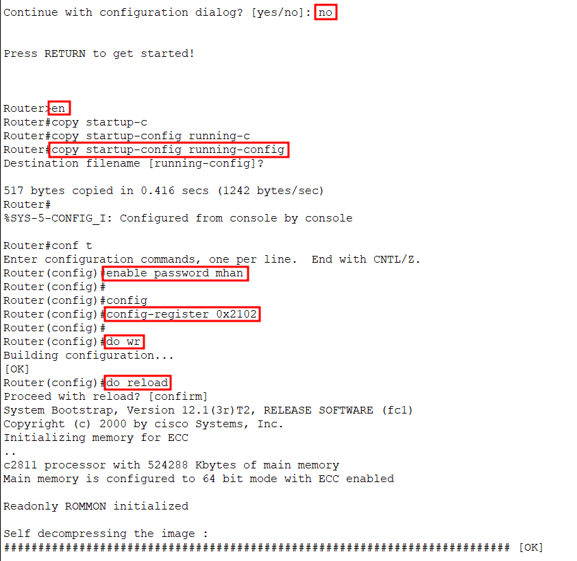 # confreg 0x2142 - 관리자모드(enable) 접속 후 startup-config를 runnig-config로 불러오기