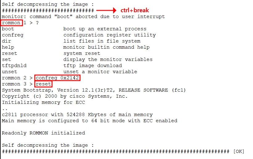 ※ ctrl+break 입력해서 rommon 모드 진입, 대화형 구성 모드 설정 후 reset