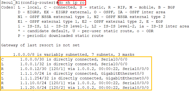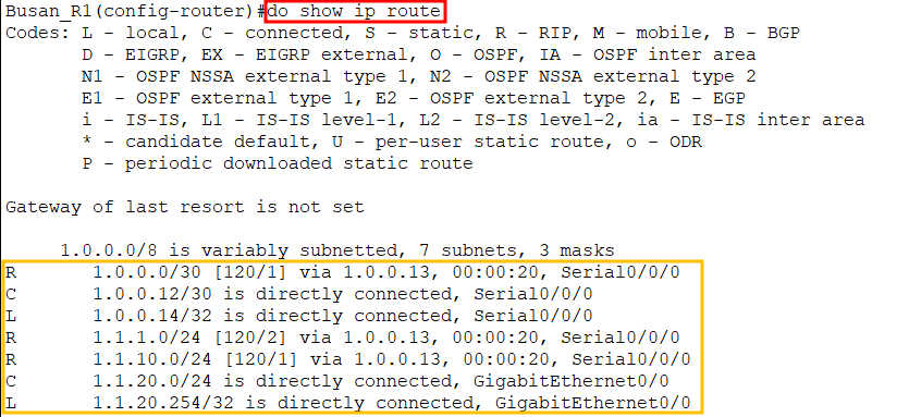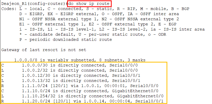 - passive-interface g0/0 : g0/0에 대해서 라우팅 프로토콜에 대한 업데이트 내용을 받기만 하고, 보내지 않음