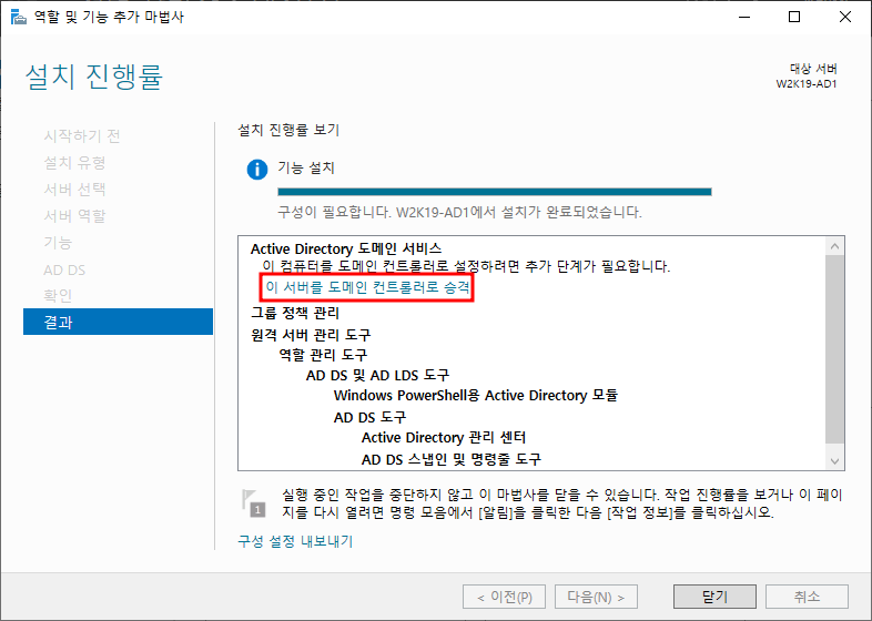 ※ 도메인 컨트롤러 설치를 위해 '이 서버를 도메인 컨트롤러로 승격' 선택하여 구성하기