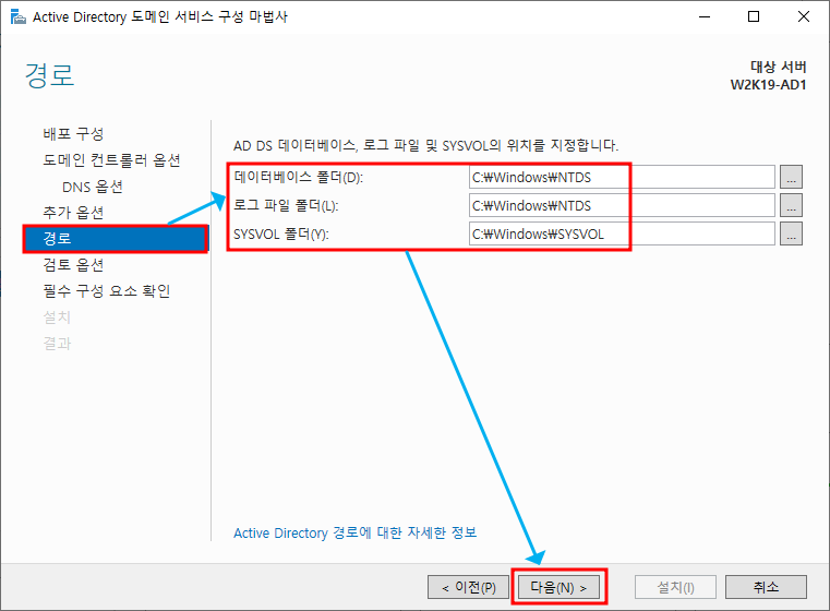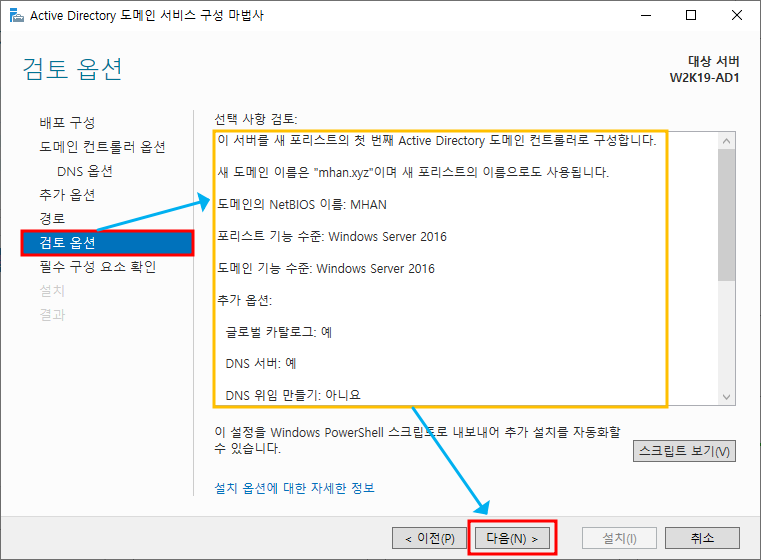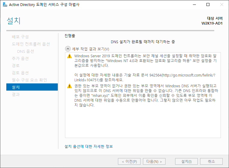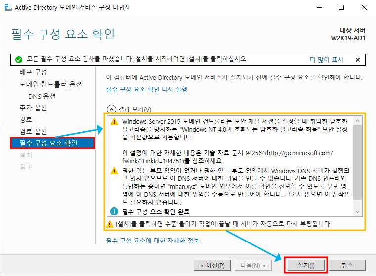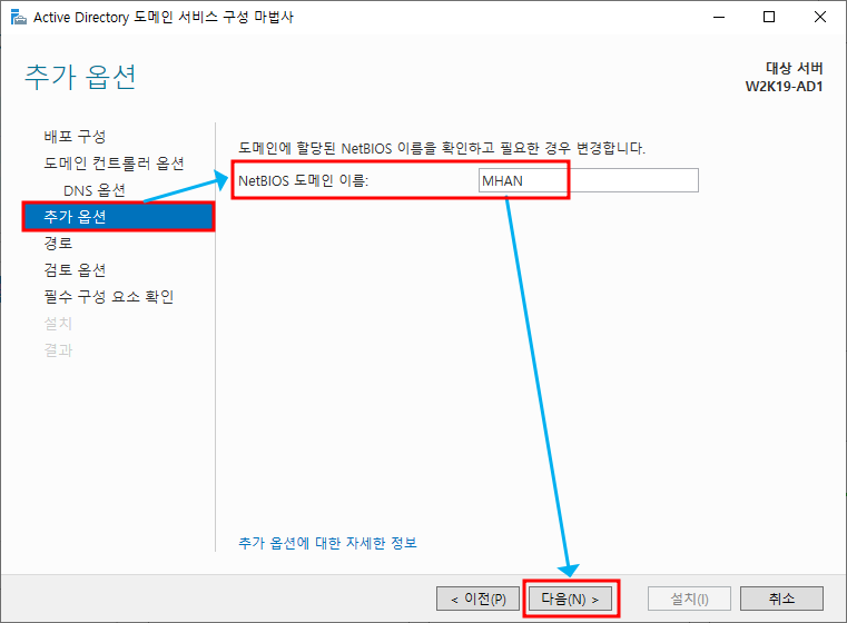 ※ 추가 옵션 - NetBIOS 도메인 이름 설정, 앞에서 설정했던 루트 도메인 이름의 앞 부분으로 설정됨