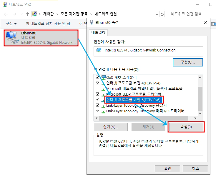 ※ 네트워크 연결 설정 → IPv6 비활성화