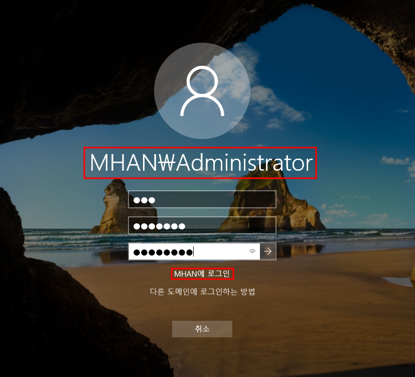 ex) mhan\adminstrator 또는 administrator@mhan.xyz