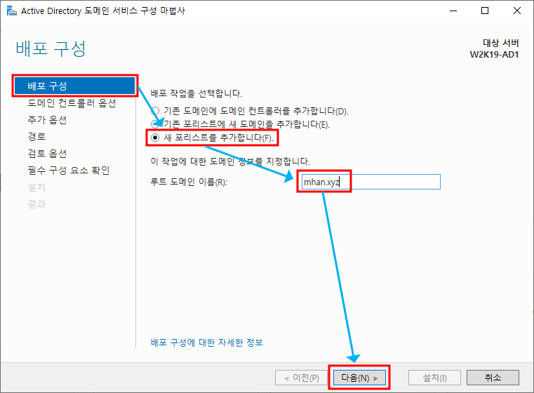 ※ 배포 구성 - 기존에 포리스트가 존재하지 않으므로 새 포리스트 추가 후 도메인 이름 지정