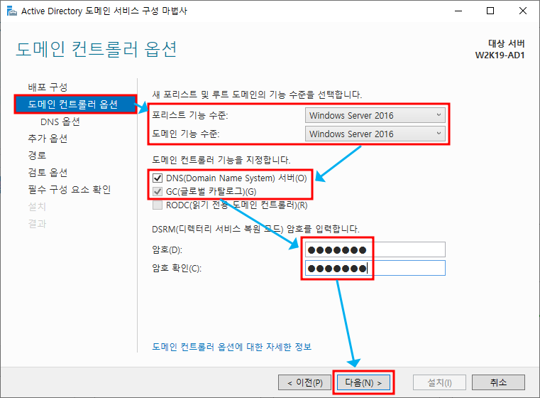 ※ 도메인 컨트롤러 옵션 - 옵션 선택 후 패스워드 설정