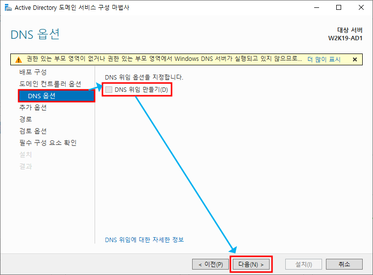 ※ DNS 옵션 - 해당 포리스트의 첫 DC이므로 부모 영역이 없어 DNS 위임도 없음