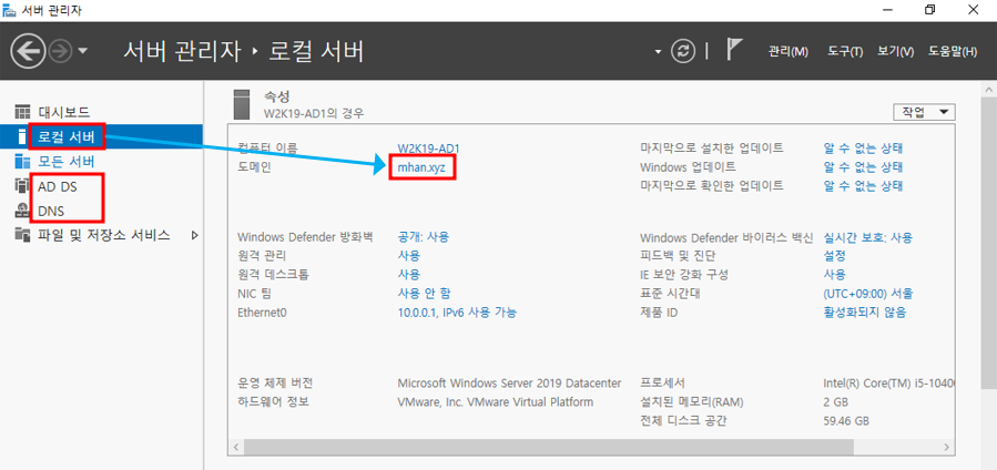 ※ 서버 관리자▶로컬 서버의 도메인 확인 및 AD DS/DNS 서비스가 설치되어 있는지 확인