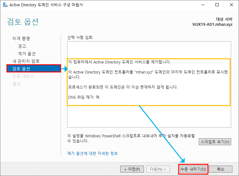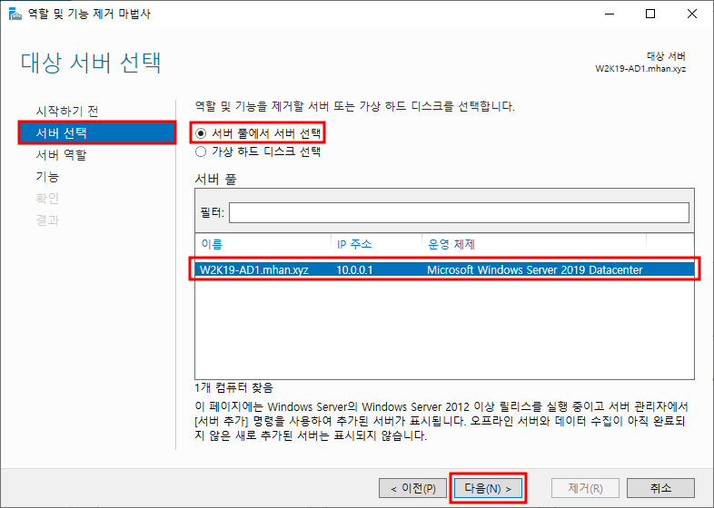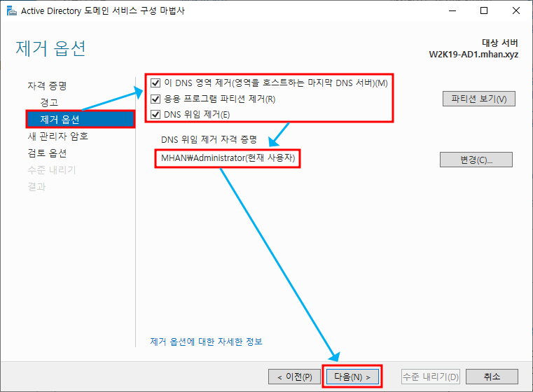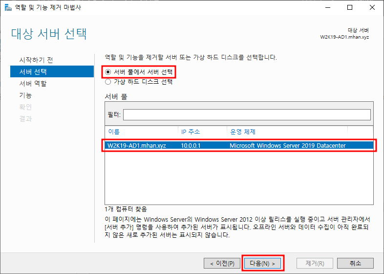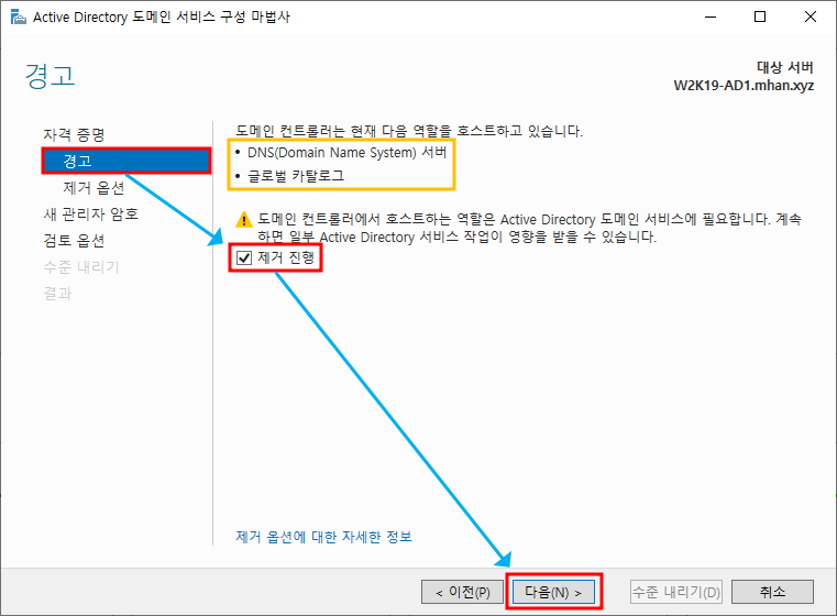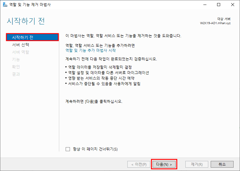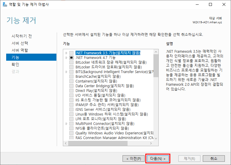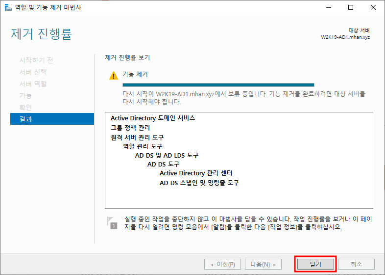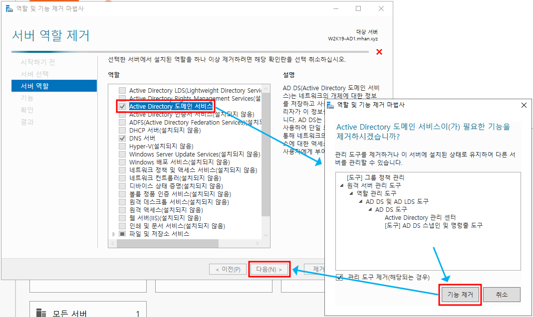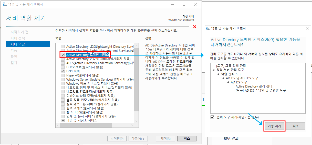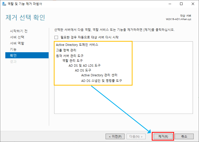 ※ 서버 역할 제거 - Active Directory 도메인 서비스 선택 후 기능 제거