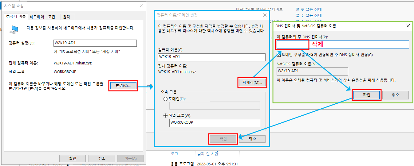 AD DS 역할을 삭제해도 작업그룹에 DNS 접미사가 남아있다. 이를 삭제해야 한다.