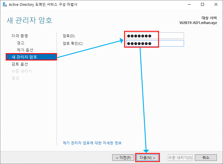 ※ 새 관리자 암호 - DC 삭제를 진행하면 더 이상 Domain으로 로그인이 불가. 로컬 Administrator의 암호를 새로 설정한다.