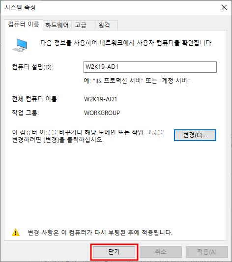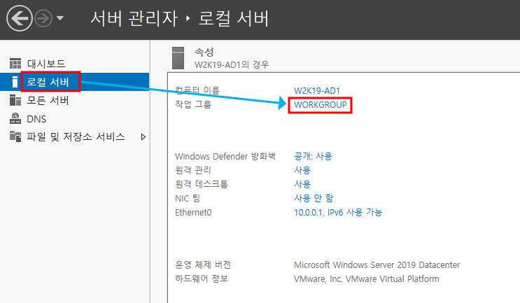 ※ 서버관리자▶로컬서버 → 작업 그룹 선택