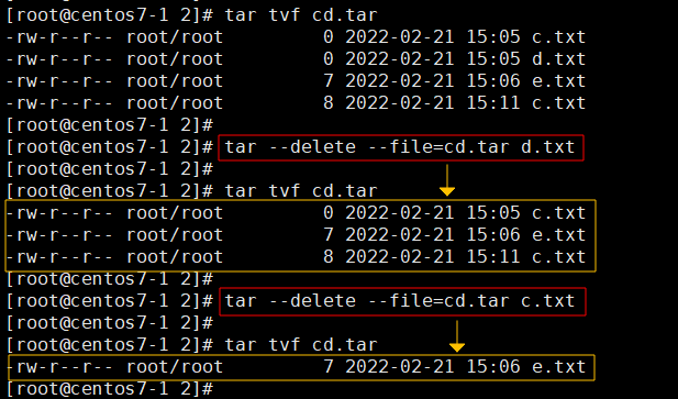 - Archive에 있는 파일 삭제 : # tar --delete --file=[아카이브파일이름] [삭제할파일명]