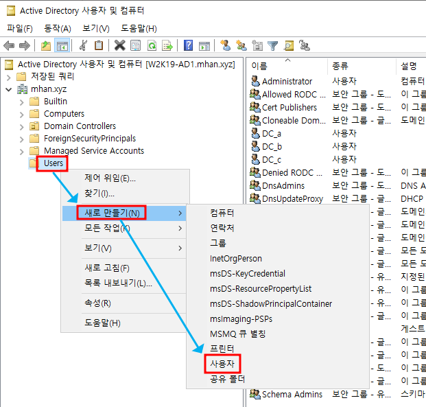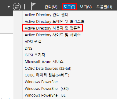 ※ 도구 → Active Directory 사용자 및 컴퓨터 열기