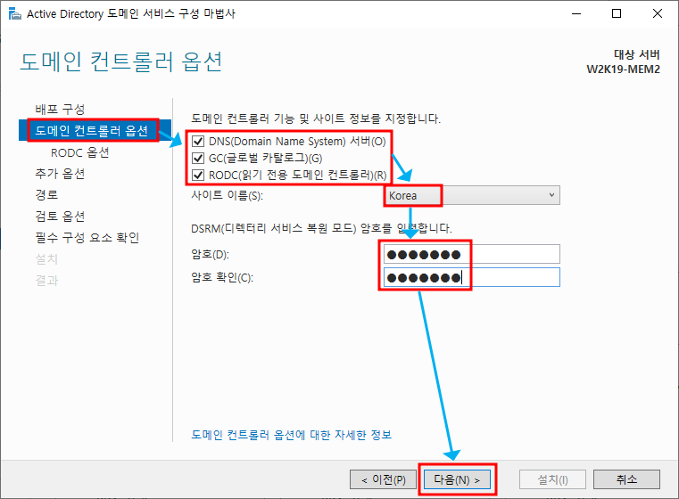 ※ 도메인 컨트롤러 옵션 - DNS, GC, RODC 체크 후 사이트 선택 및 암호 설정