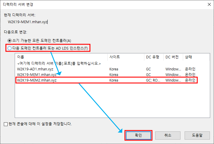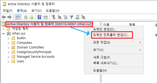 ※ Active Directory 사용자 및 컴퓨터 → 도메인 컨트롤러 변경