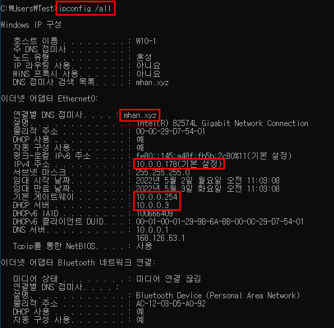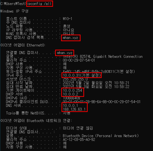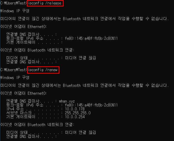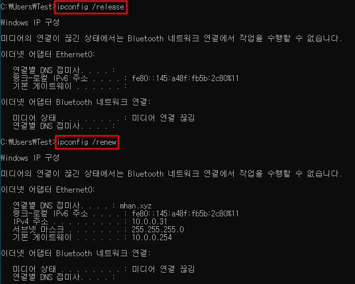 ※ W10-1에서 IP 초기화 후 다시 받아온다.