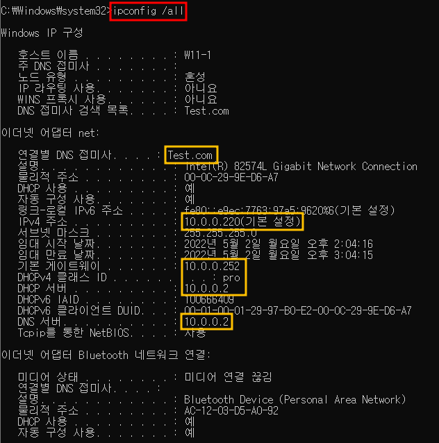 - pro 클래스에 속하며, 정책에서 설정한 범위 내의 IP인 10.0.0.220 주소를 가져오는 것을 확인할 수 있다.