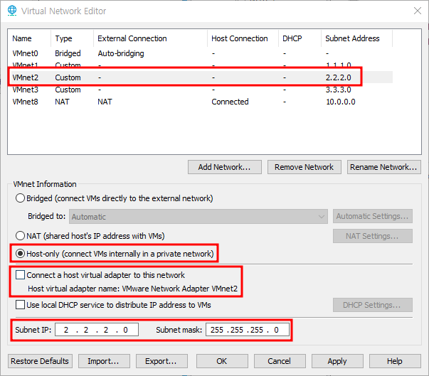- VMnet2 - 2.2.2.0 (HostOnly, 호스트 PC 연결 X)