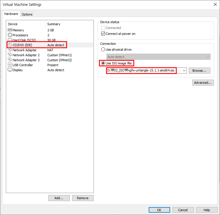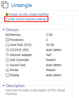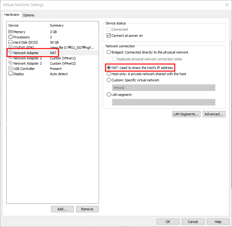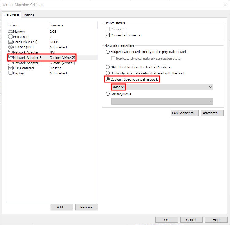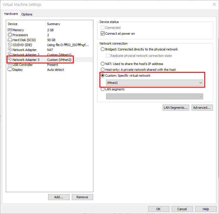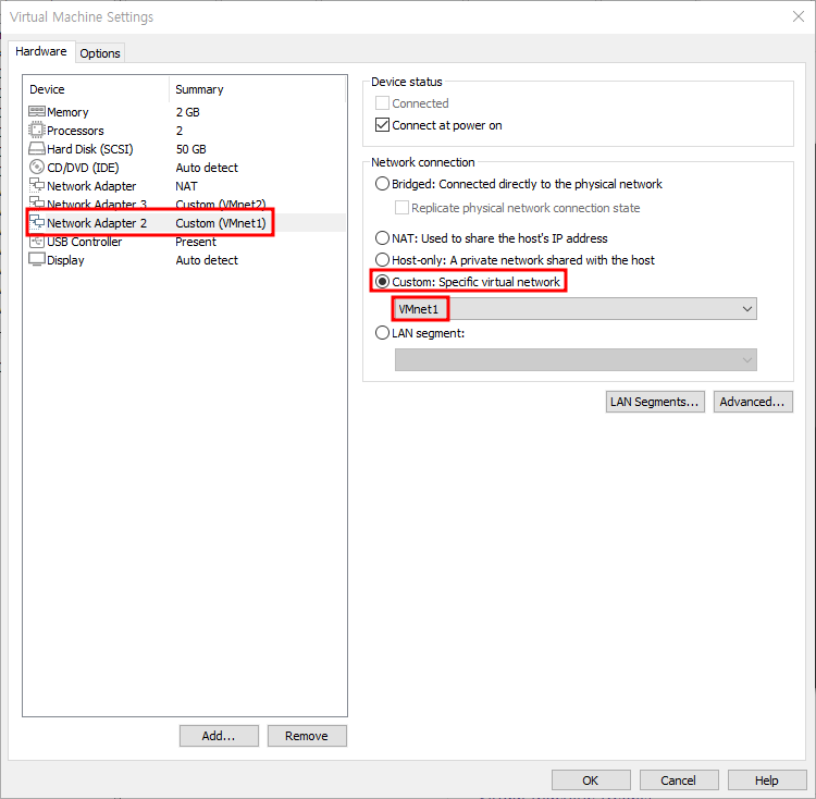 ※ Network Adapter 2 - Custom Network / VMnet1로 설정